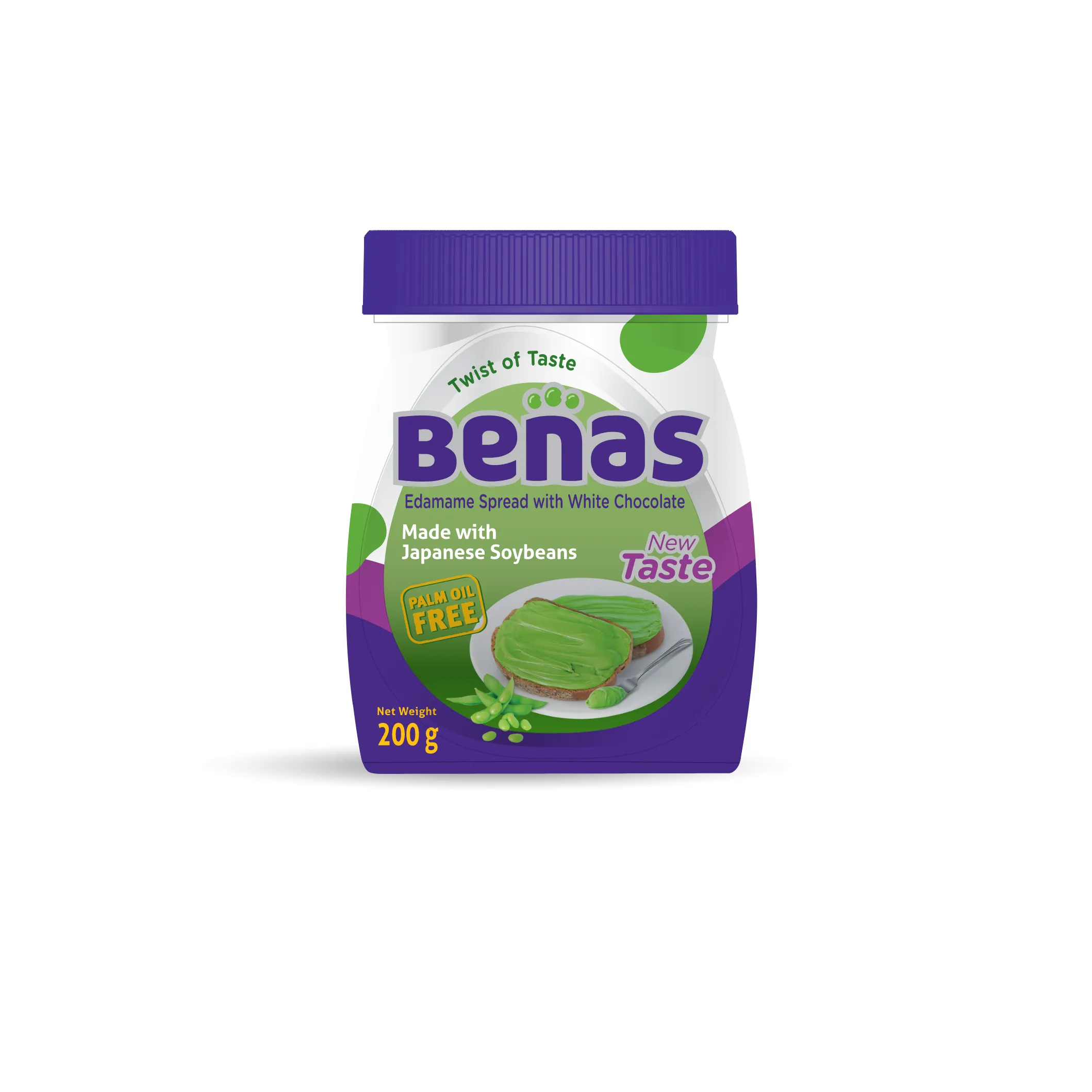 The purple color of the packaging is inspired by a variety of edamame with unique purple flowers. In addition, the shape of the packaging is inspired by the organic shape of edamame seed which is novel, distinctive and easy to grip.