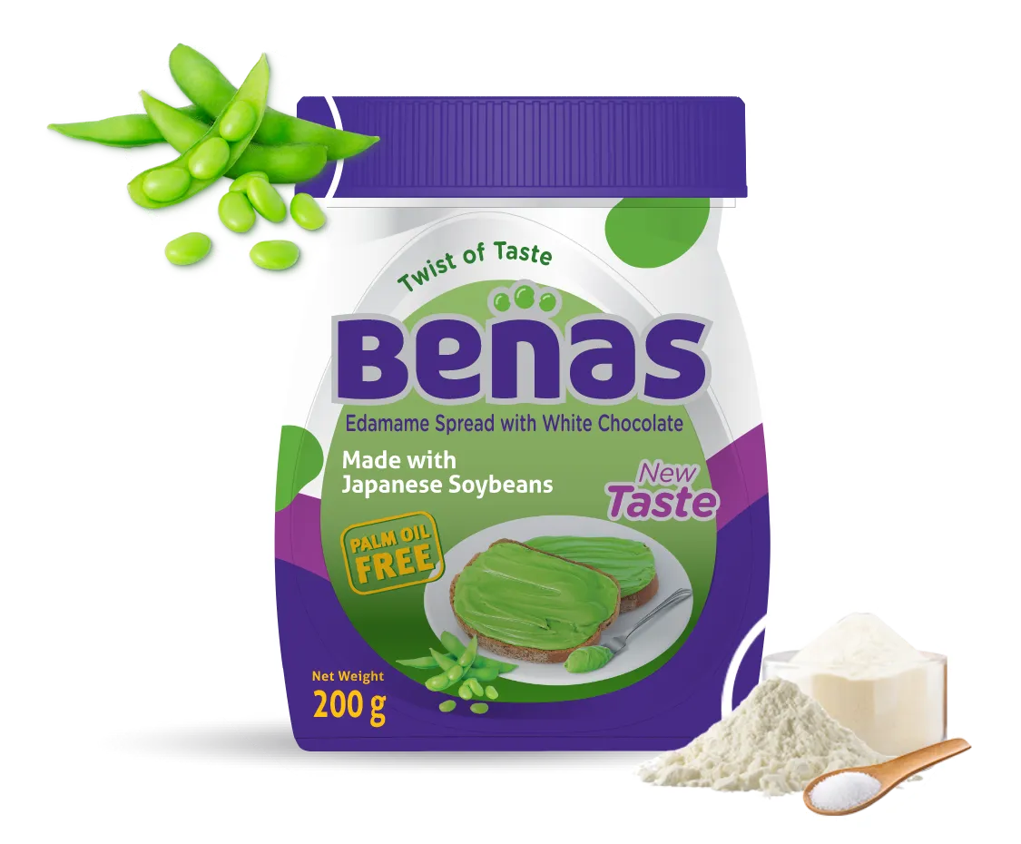 It originally comes from the word "BEANS." Then, these 5 letters are re-arranged and become a trademark "BENAS". Three symbolic edamame seeds are put together as an icon on top of the brand name.